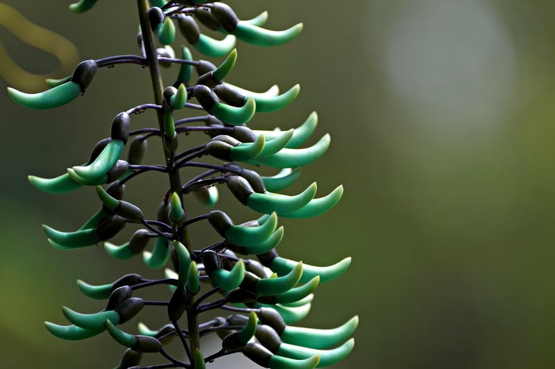 The Jade Vine, also known as Strongylodon macrobotrys, is a rare flowering plant native to the Philippines. Its striking turquoise flowers hang in clusters, resembling delicate jade-green chains. This vine is not only visually stunning but also attracts pollinators like bats and birds with its vibrant color and sweet nectar.